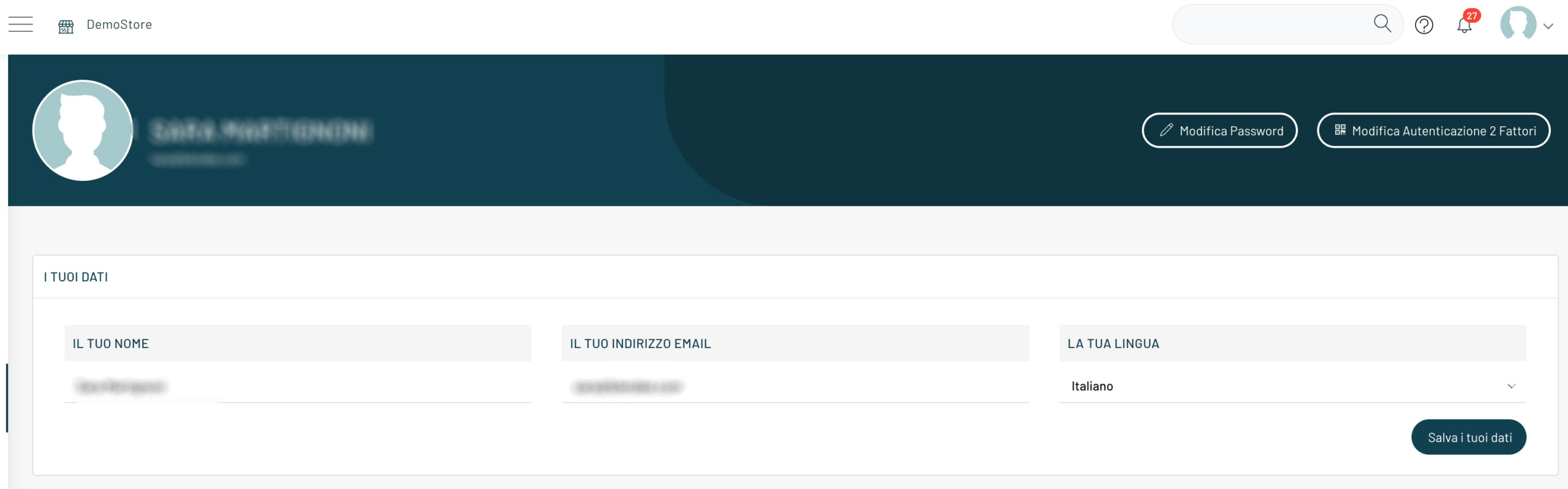 To change your name, email and language, simply edit the corresponding fields in the YOUR DATA section and confirm by clicking on the “Save your data” button at the bottom right.